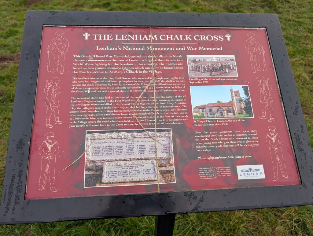 From the metal North Downs Way sign off Faversham Road, you’ll want to head straight past it, away from the main road and back onto Pilgrim’s Way. You’ll continue straight along this track for some time. Keep an eye out for the Lenham Cross, which you’ll see carved into the chalk on the left-hand side. There’s a very interesting plaque next to this memorial alongside pleasant views across to Lenham in the distance. Just past this landmark on the left is another North Downs Way stone marker showing the distance to Canterbury and Dover.