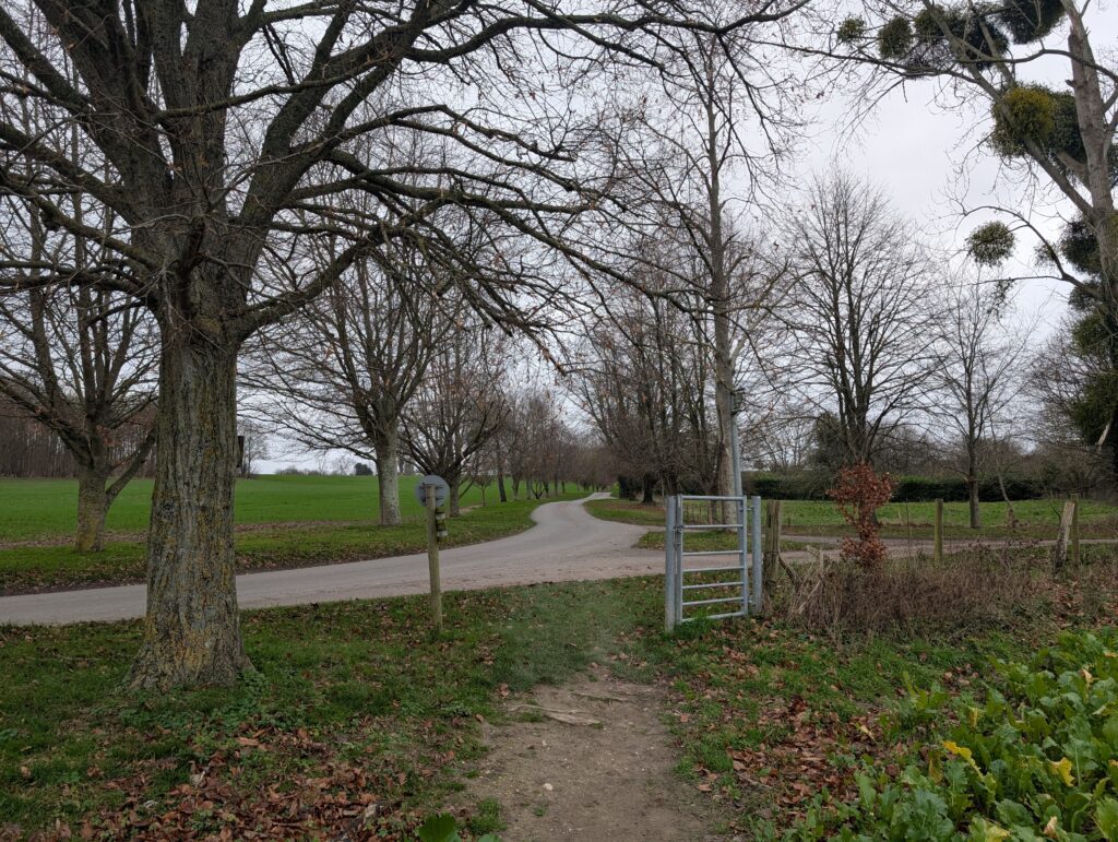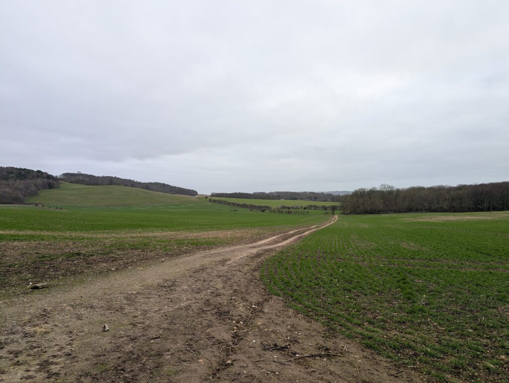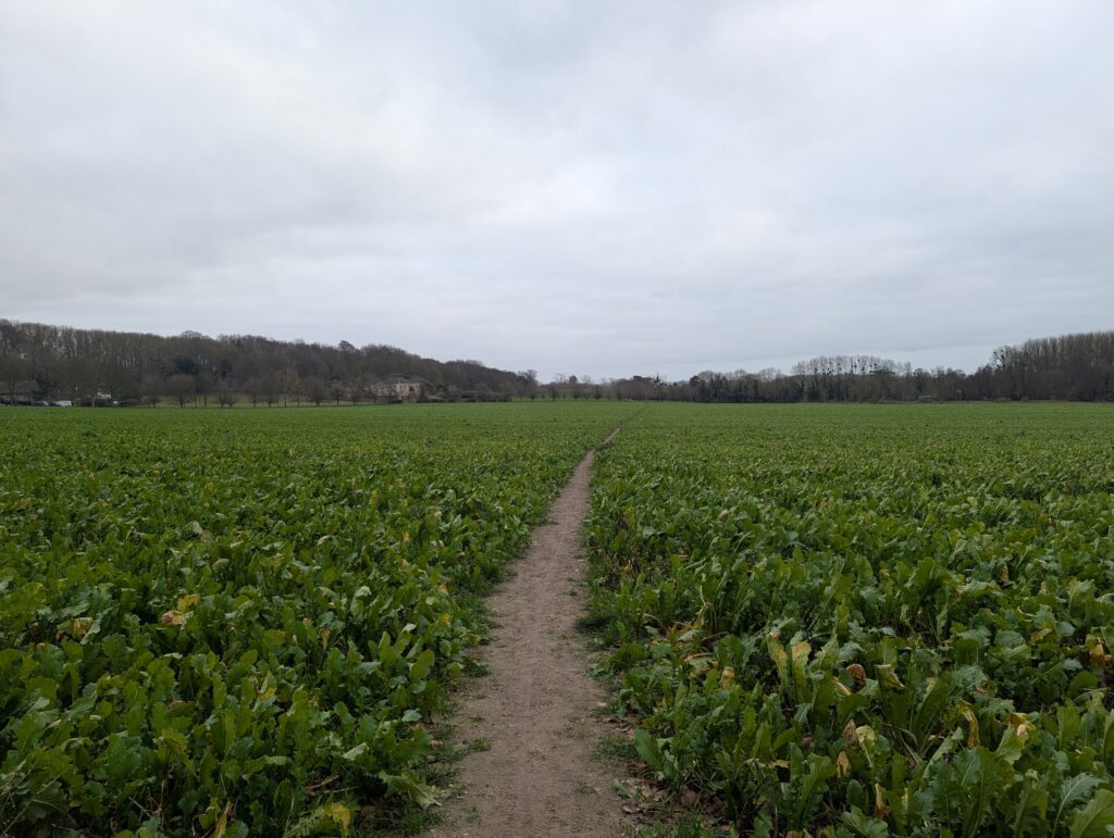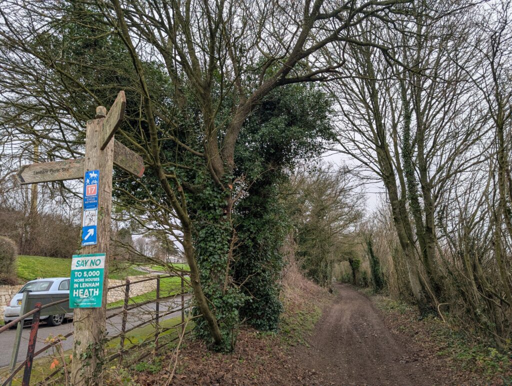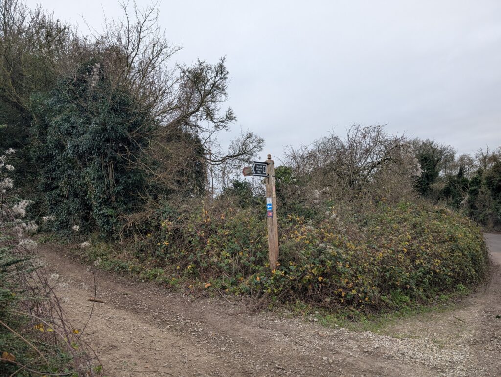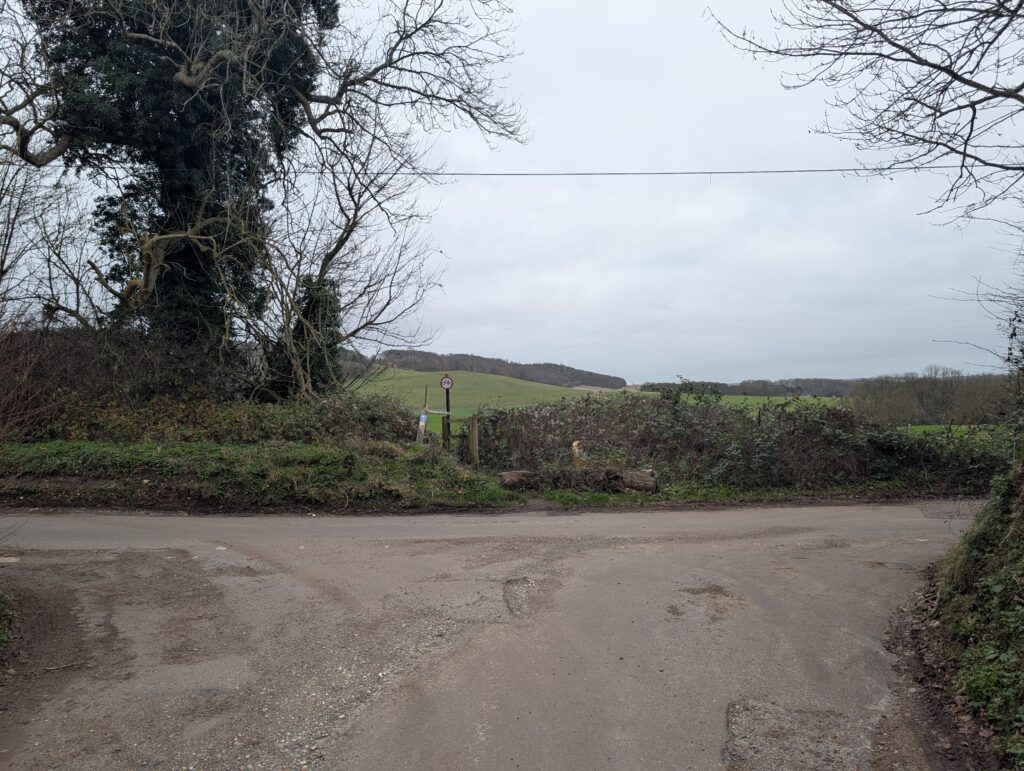 Just along this road is a lovely memorial bench on the right-hand side, which marks a good halfway point for this stretch of the trail if you want to take a quick break for lunch. Past this bench, keep heading straight along Pilgrims Way. You’ll encounter one or two bends in the path but just keep heading straight and avoid making sharp turns off any side roads. After several miles the path comes to a kind of T-junction (see image below). At the time, the sign was blown down, so it wasn’t the most clear where to go. Once again, you’ll want to just keep heading straight on, this time coming out onto a large open field.