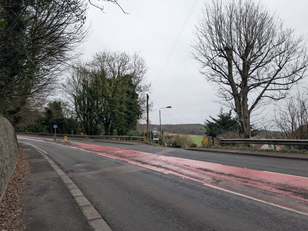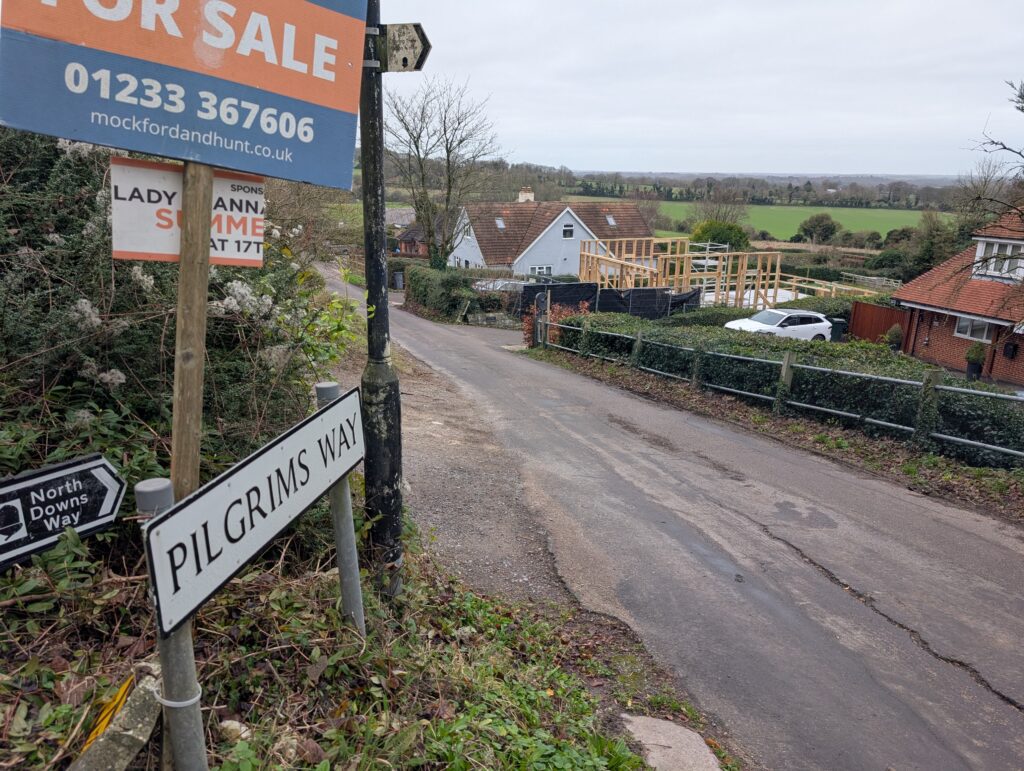 Continue straight along for another mile or so until the path connects with the busy A252 bypass. Dogs should definitely be kept on leads here, as traffic is very fast and you’ll need to cross this road. There’s also a bit of a blind bend on the left, so be extra careful. You’ll see a road sign for Pilgrim’s Way directly across the road and on the left.