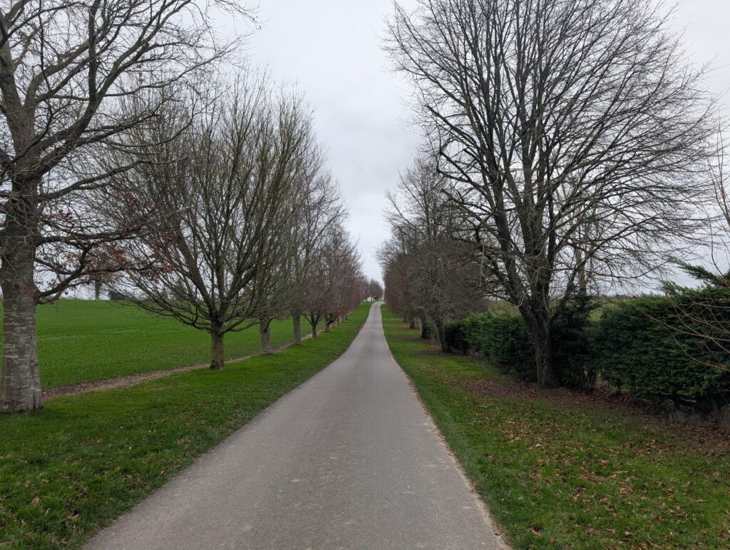 Once on the field, the path bends immediately left and then right, taking you directly across the field. You’ll be walking across fields for quite some time until the path takes a right turn, crossing a small wooded section before coming out into another field, where you’ll take a left turn. From here, continue straight on until the path exits the field and joins a small road. The small path across the last fields kind of makes you feel like you’re Russel Crowe at the end of Gladiator.