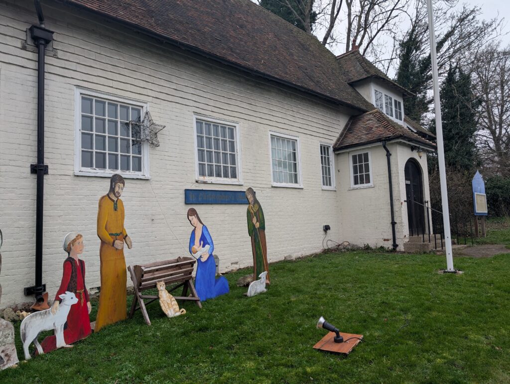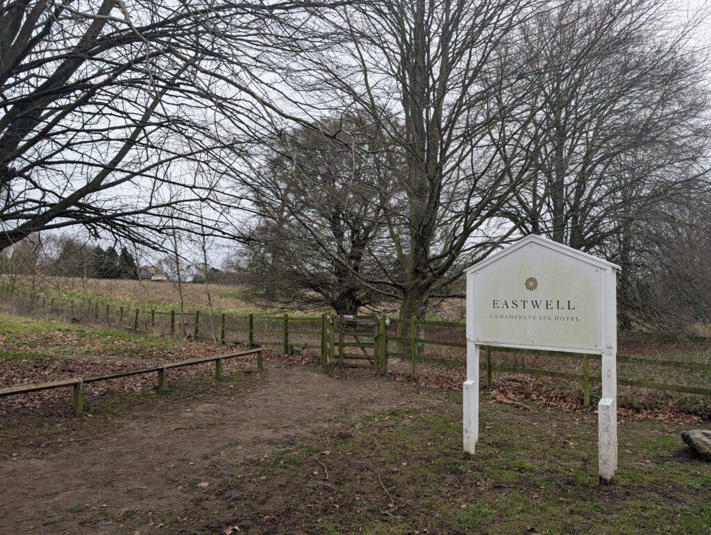 Past the T-Junction, you’ll walk briefly along a small ridge before taking a slight left, moving down the ridge and crossing the road that leads to the Eastwell Spa & Hotel. You’ll also pass a sign for this hotel (see image below). The path then takes you through a small opening in a hedge before connecting with the A251. Here you take an immediate left, passing by St Christopher’s Church on your left.