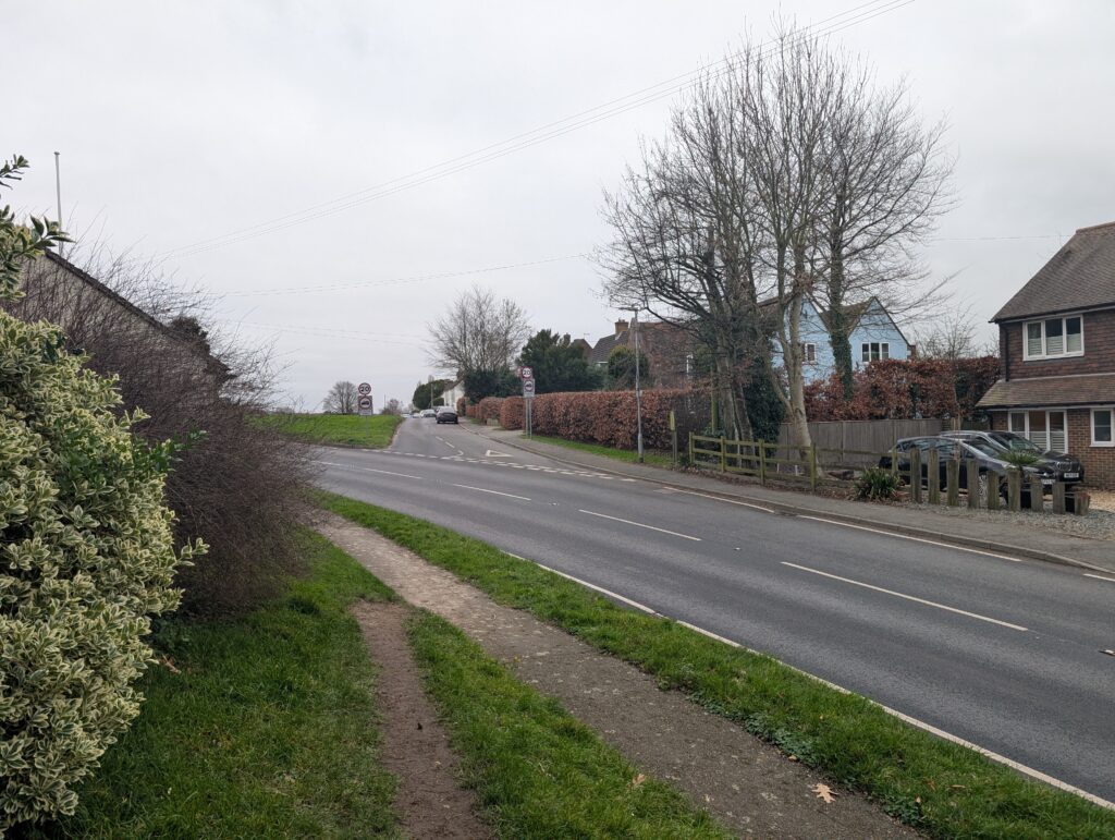 From here, you’ll want to carefully cross the A251 and walk down the right side of the Boughton Lees green. On the far side of the green, you’ll cross Wye Road before heading back onto Pilgrims Way. This crossing is a bit perilous for pedestrians as there isn’t great visibility on this bend. You’ll continue for a short while along Pilgrims Way before reaching the next metal North Downs Way marker signalling the end of this section.